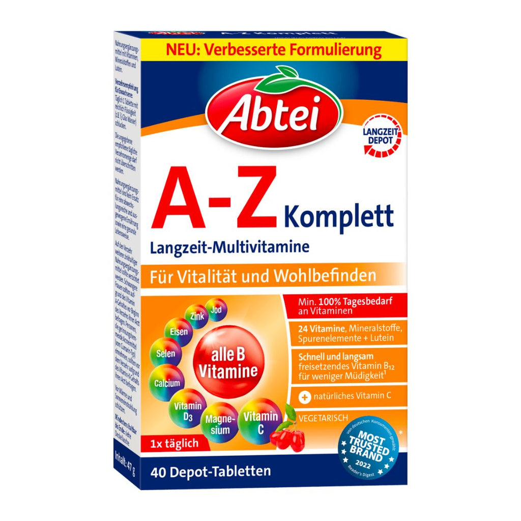 Abtei A-Z Complete has a vital core that releases the nutrients from its long-term depot over several hours. Abtei A-Z Complete contains important vitamins and minerals in sufficient quantities to meet daily requirements. Abtei A-Z has a vital core that releases the nutrients from its long-term depot for several hours. Abtei A-Z Complete contains important vitamins and minerals in day-to-day quantity.