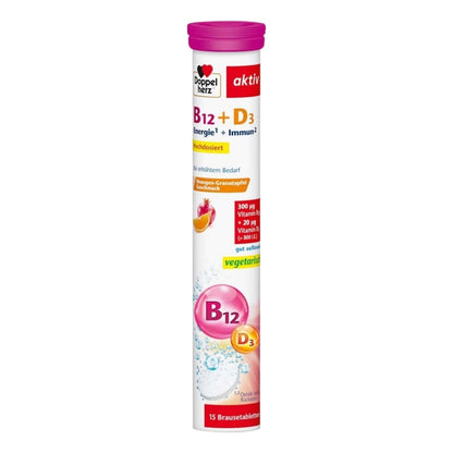 High-dose effervescent tablets with a fruity orange-pomegranate flavor. The Doppelherz active vitamin B12 + D3 effervescent tablets offer an ideal combination of vitamin B12 and vitamin D3, which contribute to the normal function of the immune system and to the reduction of tiredness and exhaustion. The effervescent tablets are easy to use and refreshing with a pleasant taste.