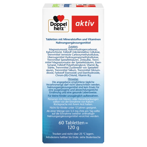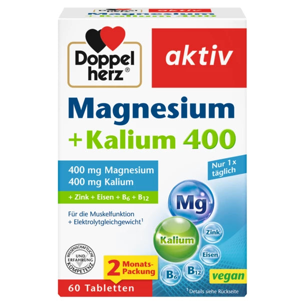 Doppelherz Magnesium + Potassium tablets is a dietary supplement with magnesium, potassium as well as zinc, chromium, iron and vitamins B6 and B12. Magnesium as a contribution to muscle function and the electrolyte balance. In the case of an unbalanced diet in connection with an increased need for nutrients, e.g. through physical exertion, the diet can be supplemented