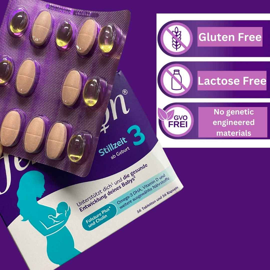 Femibion 3 Breastfeeding is a German-formulated dietary supplement designed for lactating women to support both mother and baby with essential nutrients including folate, DHA, choline, vitamins, calcium, iron, and iodine