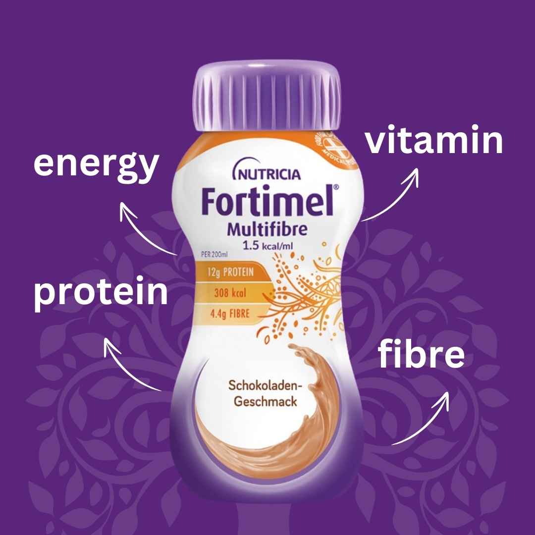 Fortimel® Multifibre 1.5 kcal chocolate is a high-calorie drinking food with fiber and all important nutrients, vitamins, minerals and trace elements. So that you can regain your strength!