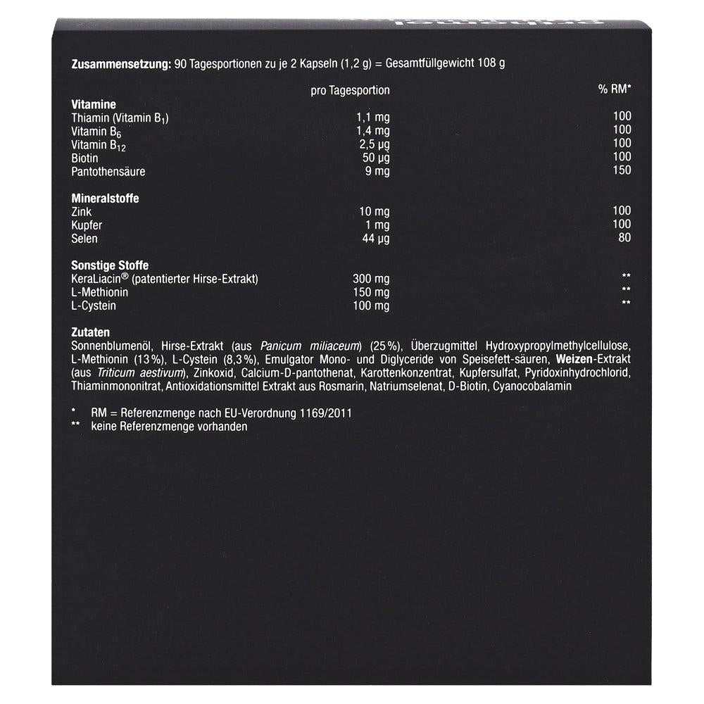 Hair supplement that provides a combination of micronutrients and B vitamins with the amino acids L-cysteine and L-methionine and also the patented millet extract KeraLiacin.