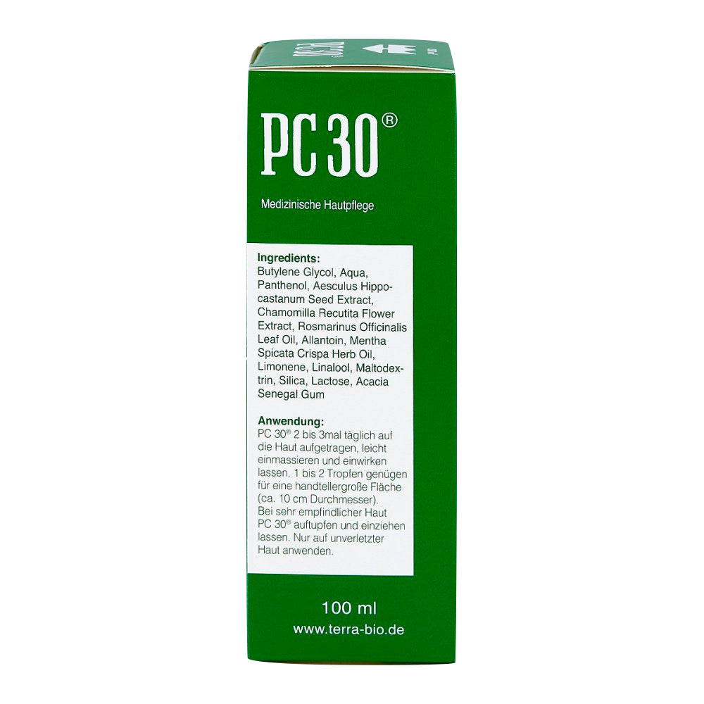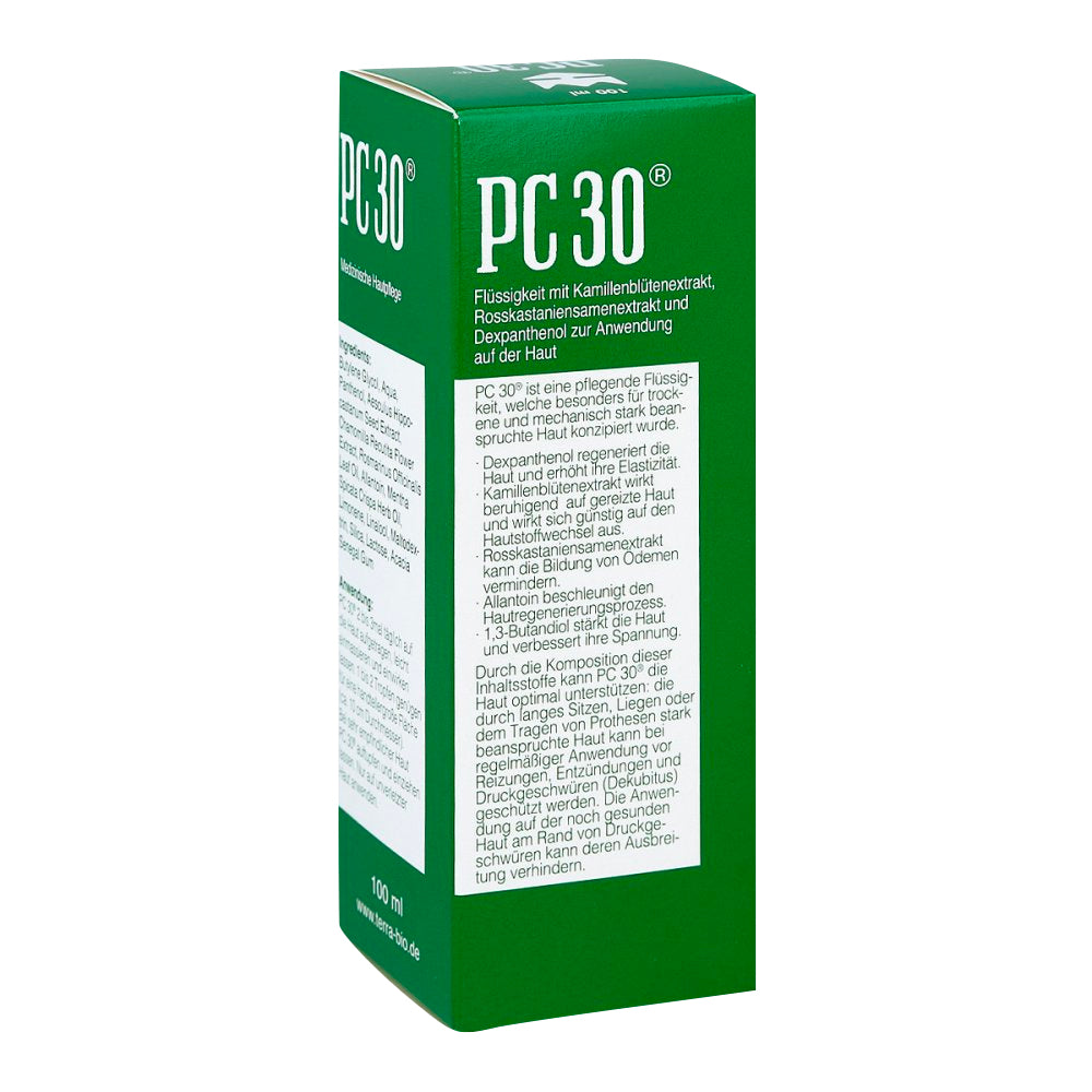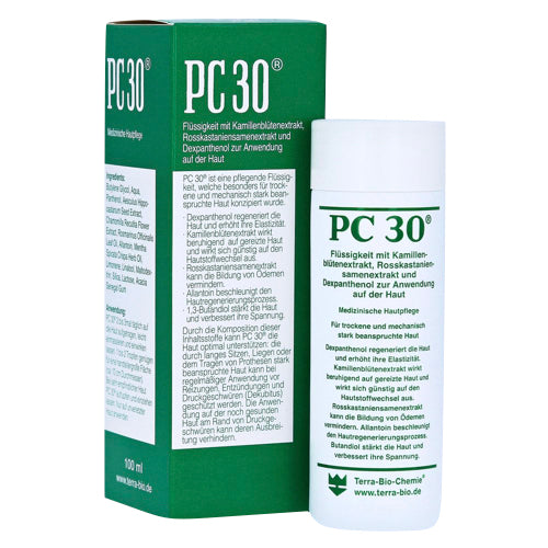 and dexpanthenol for use on the skin. PC 30® is a nourishing liquid, which has been specifically designed for dry and mechanically stressed skin. The composition of these ingredients means that PC 30 can provide optimal support for the skin: skin that is heavily stressed by long periods of sitting, lying down or wearing prostheses can be protected from irritation, inflammation and pressure sores (decubitus) with regular use. Application to the still-sung skin at the edge of pressure sores can prevent them from spreading