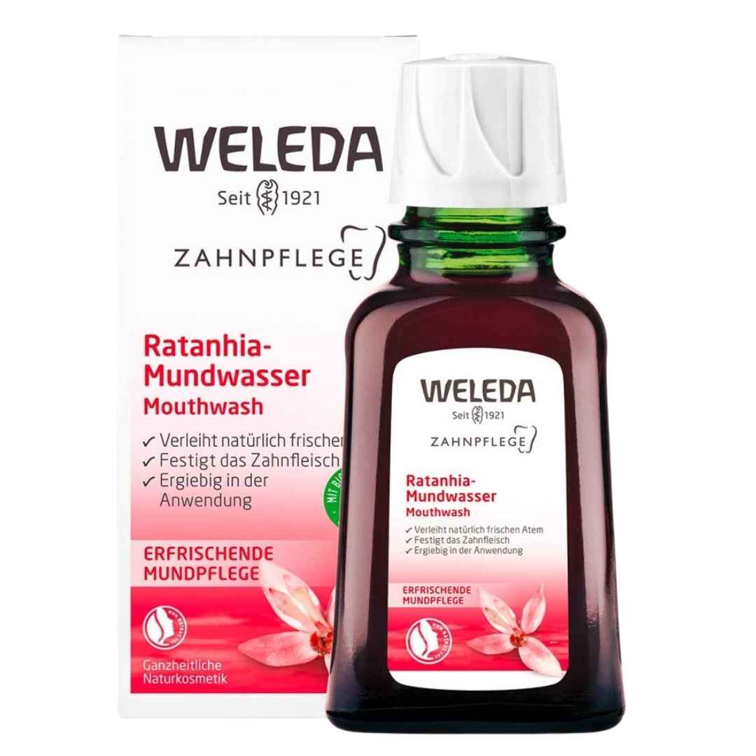 The Weleda Ratanhia mouthwash stimulates the natural functions of the oral mucosa and the oral flora by essential oils and mineral substances and provides fresh breath without taste impairment. Excerpts from the Peruvian Ratanhiapflanze and myrrh strengthen the gums and oral mucosa, and thus help prevent inflammation and bleeding gums